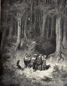 Le Petit Poucet’ parents, very poor woodcutters, since they couldn’t feed him and his six brothers any longer, decide to abondon him in a wood. Le Petit Poucet, guessing something, has listened to his parents’ talking and while going into the wood, he leaves, behind himself a trace of pebbles and bread crumbs with which he had filled up his pockets so as to know how to go back. Many attempts of abondonment follow as long as one of them is successful.